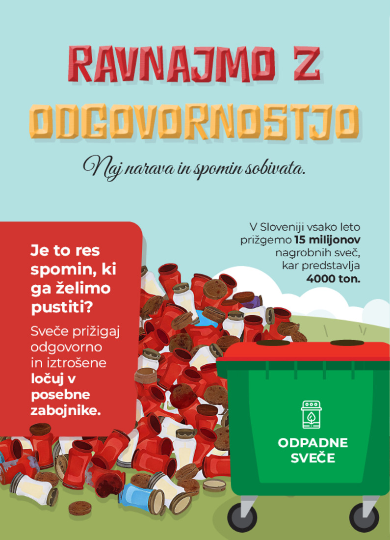 V Sloveniji letno odvržemo več kot 4.000 ton odpadnih nagrobnih sveč, zato Zbornica komunalnega gospodarstva Slovenije v sodelovanju s komunalnimi podjetji poziva k odgovornemu ravnanju s svečami in izbiri trajnostnih načinov spomina.