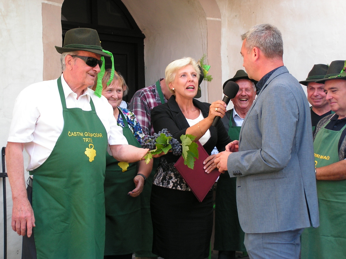 Sledila je trgatev. Prvi grozd je obral skrbnik trte Anton Zaletelj in ga ponudil v oceno častnemu gospodarju trte Antonu Kovšetu, inž. in gospodarju trte Miranu Pušniki, univ. dipl. inž., ki je tudi dal dovoljenje, da se trgatev lahko začne.