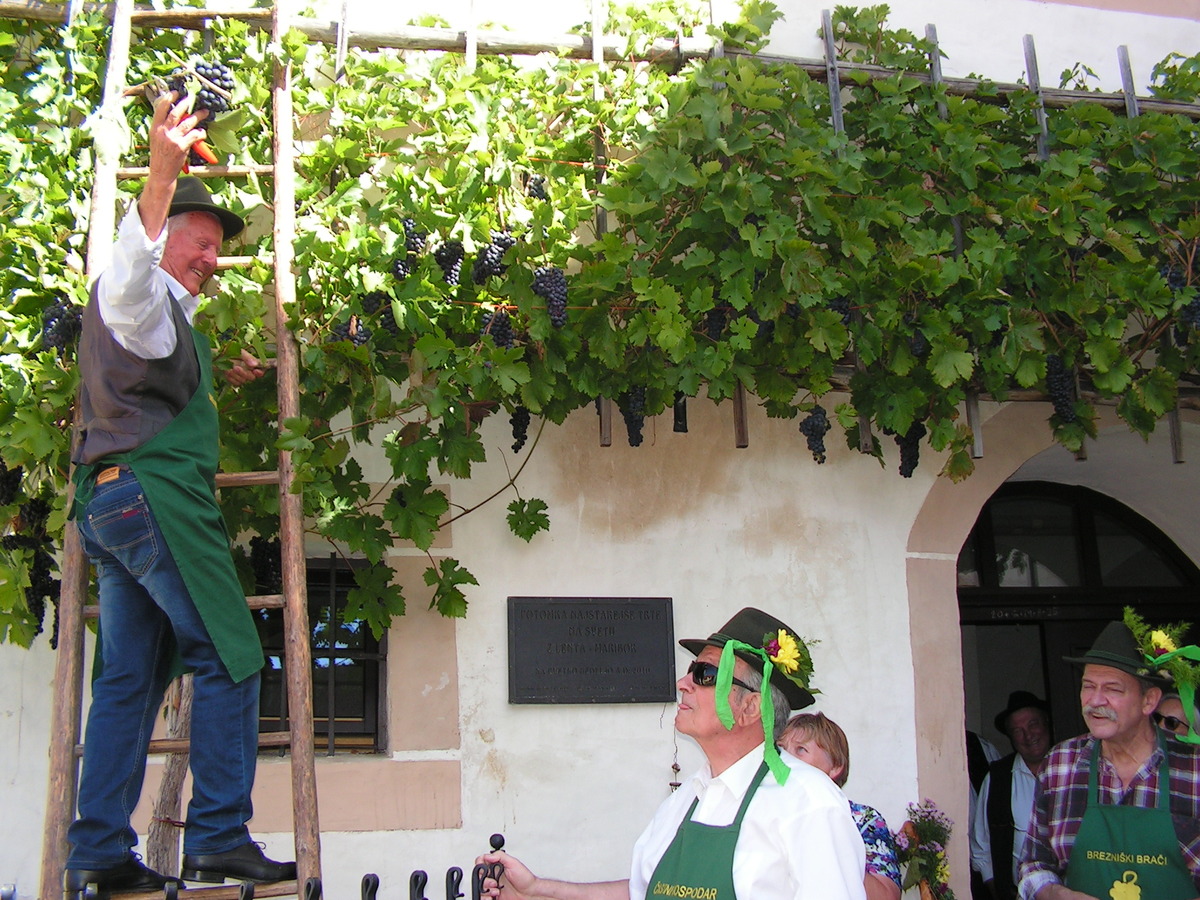 Letošnja trgatev potomke najstarejše trte na svetu v Breznu, ki je bila 21. 9. 2025, je bila še posebej slovesna, saj je bila jubilejna – že petnajsta. Številne zbrane je pozdravila voditeljica programa, ki je pripravila tudi njegovo vsebino, Slavica Pečovnik Urh. Med njimi je pozdravila župana Občine Podvelka in gospodarja trte Mirana Pušnika, univ.dipl.inž., častnega gospodarja trte in častnega občana Antona Kovšeta, inž., častno občanko Marijo Poglajen, častnega občana mag. Jožeta Marhla, skrbnika trte Antona Zaletelja, domačega župnika Jožeta Motalna in duhovnega pomočnika Župnije Brezno prof. dr. Vinka Potočnika.