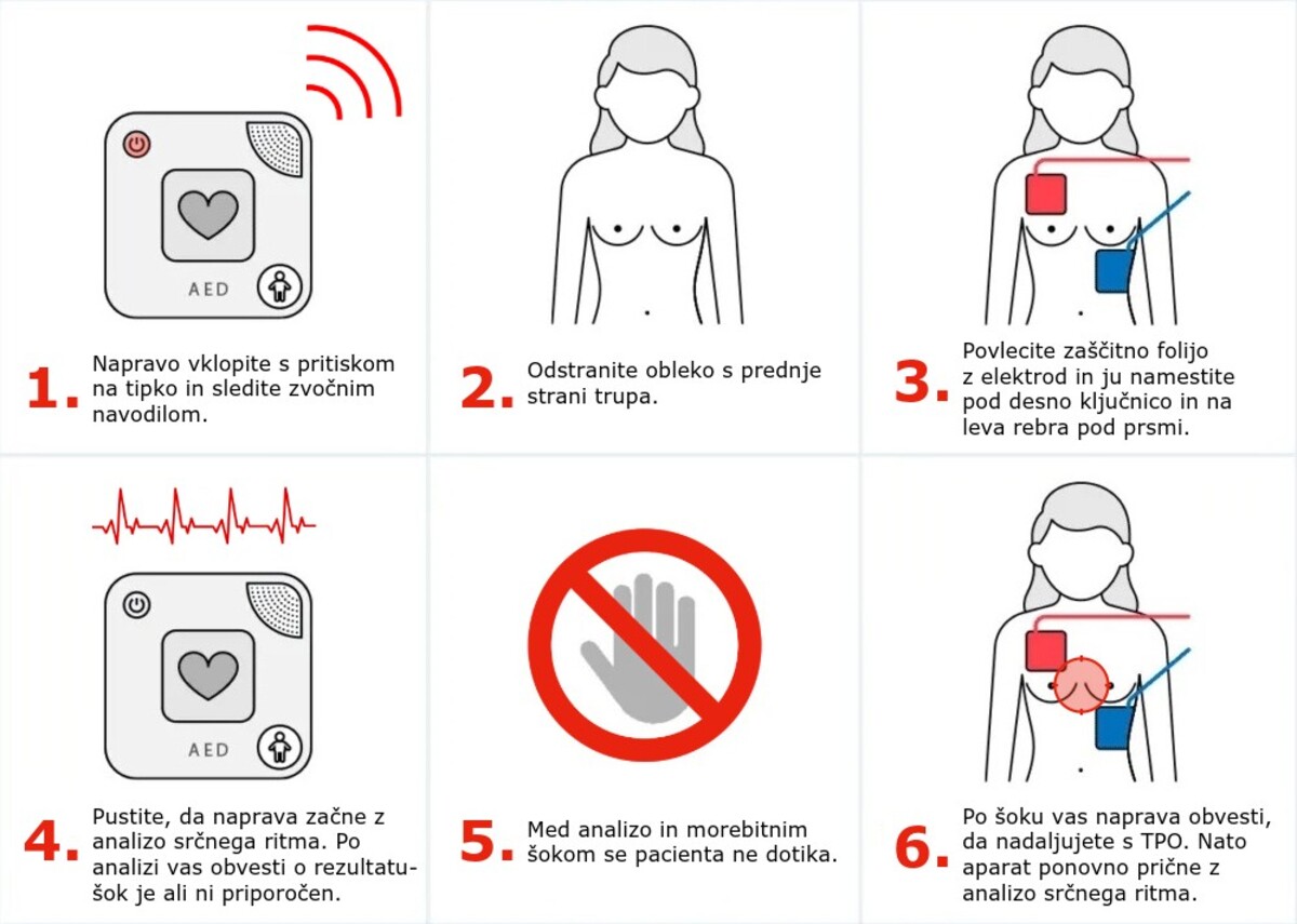 AED (avtomatski zunanji defibrilator) je prenosna naprava, ki s kontroliranim električnim sunkom lahko ponovno vzpostavi normalen srčni ritem. Naprava sama prepozna ali je šok potreben in uporabnika glasovno vodi skozi celoten postopek. Zasnovana je tako, da jo lahko uporablja vsak laik - brez predhodnega medicinskega znanja.