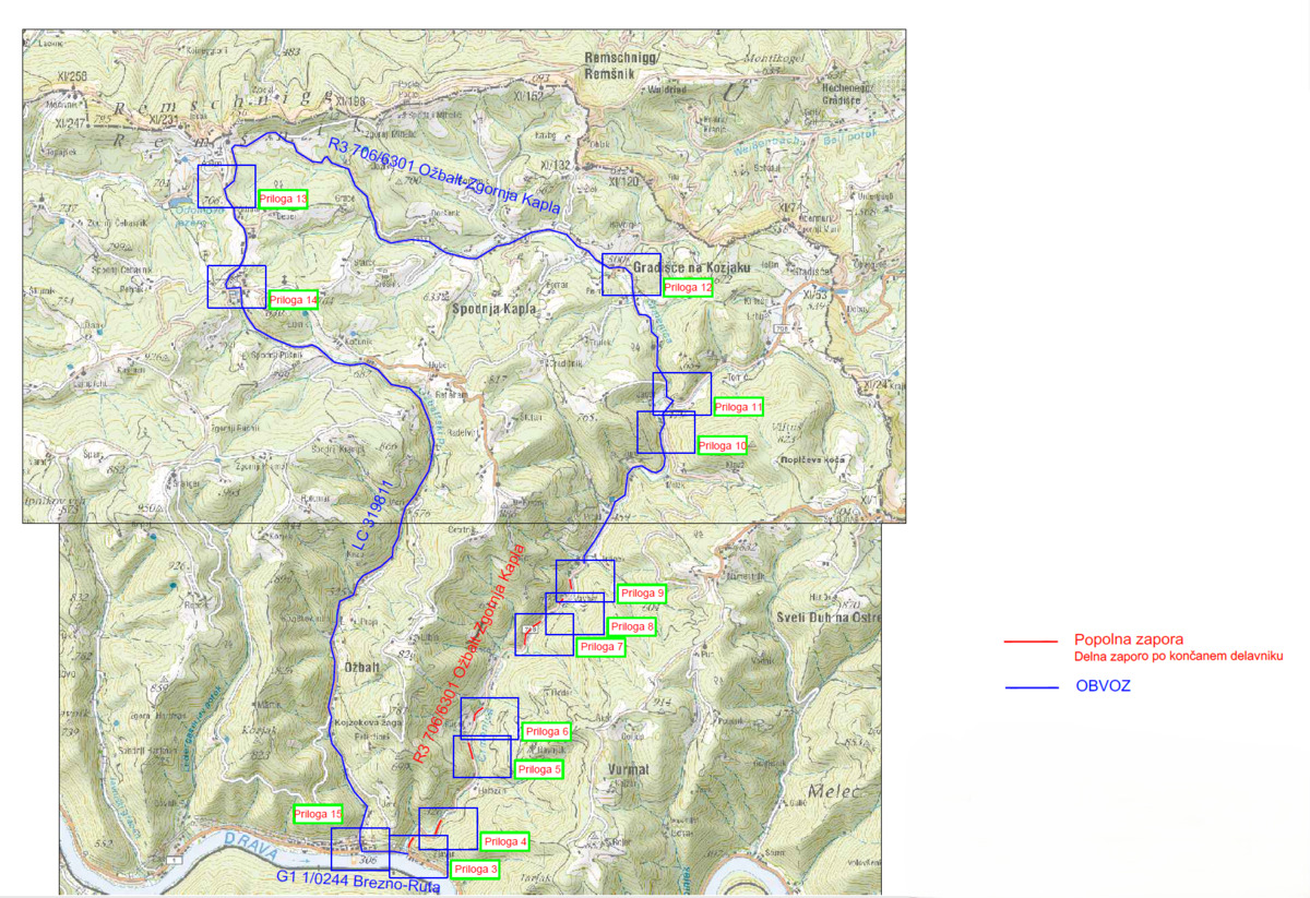 Obvoz bo v času popolne zapore urejen po državni cesti R3-706/6301 in lokalni cesti LC 319811 Ožbalt – Kapla (skica zapore v prilogah).