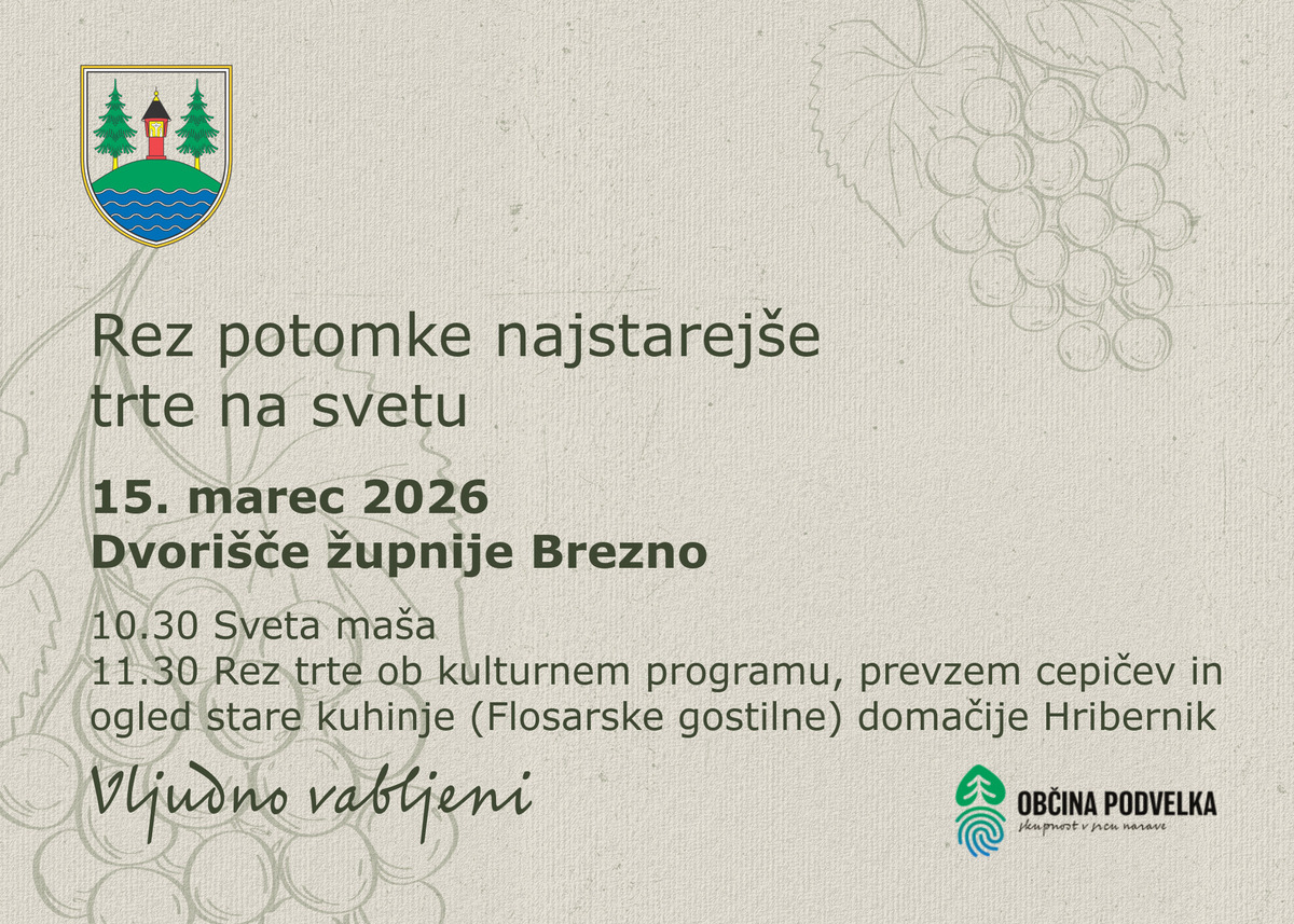 Vljudno vabljeni na rez potomke najstarejše trte na svetu, ki bo v nedeljo, 15. 3. 2026, na dvorišču župnije Brezno.